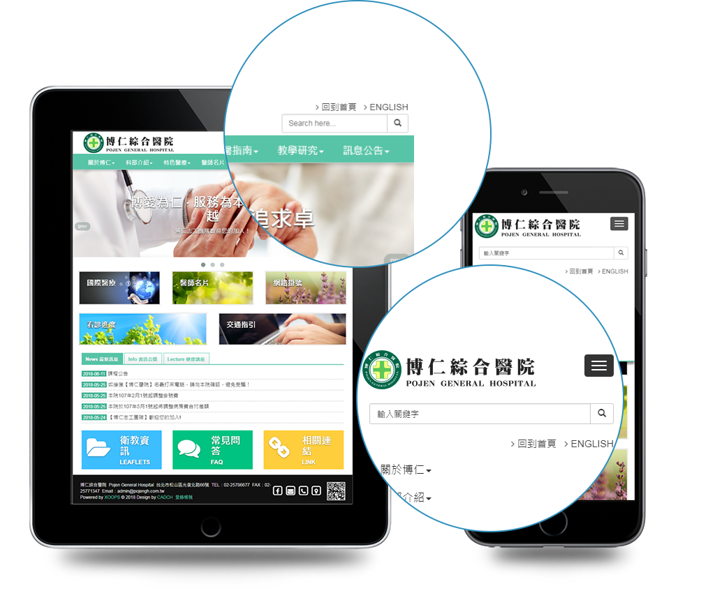 博仁綜合醫院位於台北市,是我們醫療院所網站改版案例之一,針對醫療相關規定與醫院形象、網站設立成本三方考量下,完成博仁綜合醫院響應式網站改版。博仁網站設計成具有後台管理的CMS系統,每個網頁都是由博仁各單位管理,不同單位有不同管理項目,利用網站群組化權限管理功能,讓醫院其他同仁可以同時間上架網頁內容。